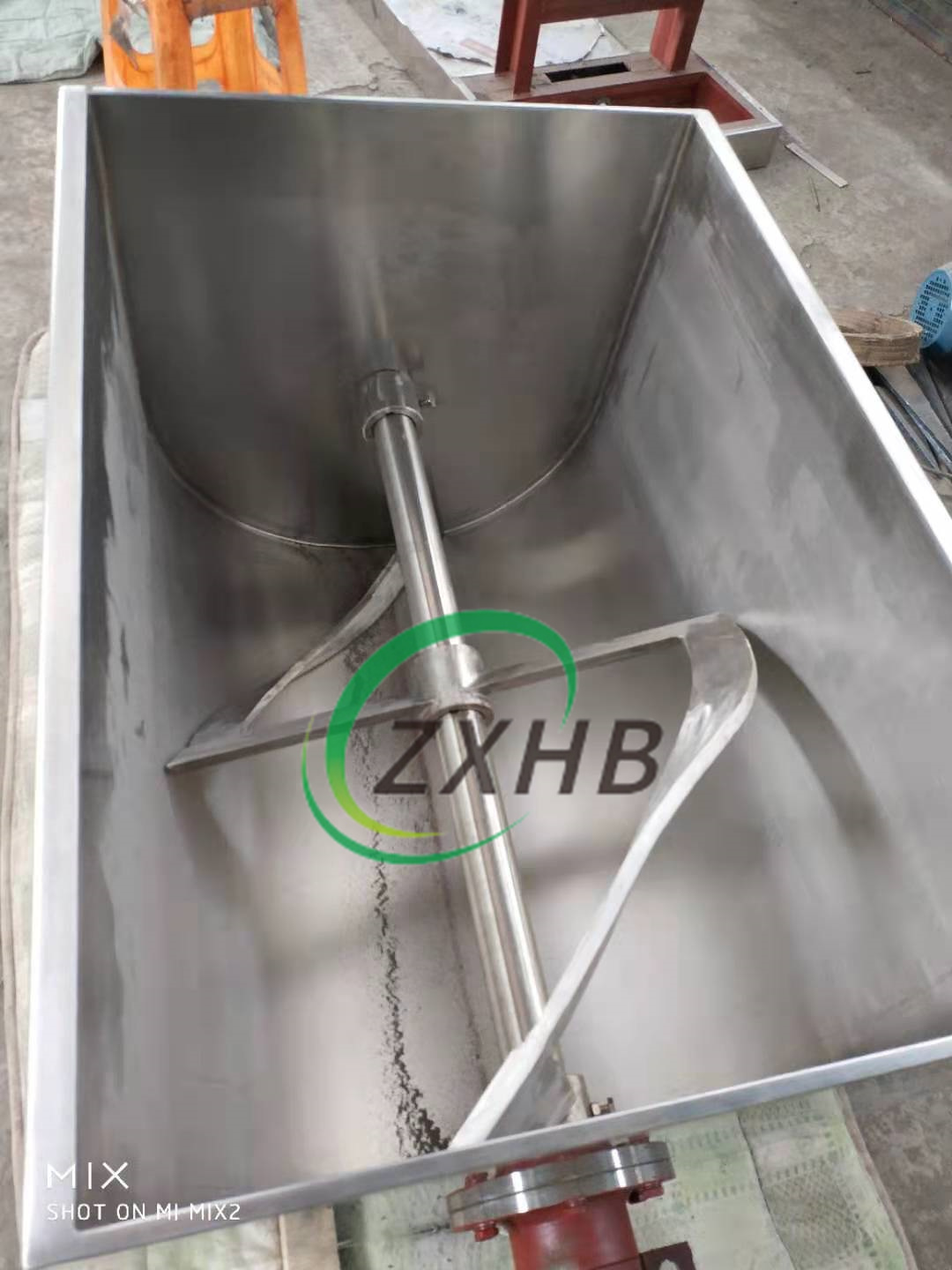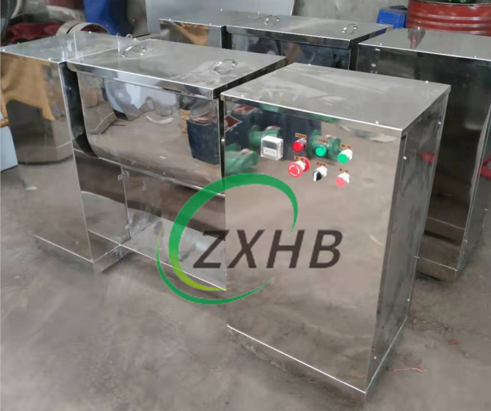 是臥式槽形單槳混合,攪抖槳為通軸式,便于清洗。與物體接觸處全采用不銹鋼制成,有良好的耐腐蝕性,混合槽可自動翻轉(zhuǎn)倒料。